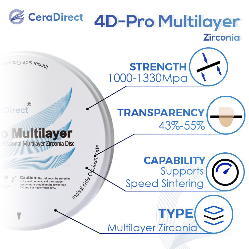 La zircone multicouche Ceradirect 4D-Pro est un matériau de restauration dentaire offrant un rendu esthétique exceptionnel, très proche de l'aspect des dents naturelles, et dont la mise en œuvre est simple. La technologie 4D-Pro Multilayer permet également un frittage rapide, réduisant considérablement le temps de traitement et améliorant l'efficacité. Colle FlowArt pour obtenir de meilleurs résultats